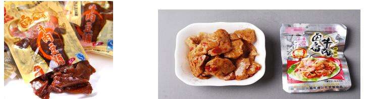 由于花生蛋白具有極佳的纖維絲狀結(jié)構(gòu),咀嚼感強(qiáng)且口感細(xì)膩,利用其良好的吸水性、吸油性,可用來(lái)制作牛肉豆脯,手撕素肉等休閑麻辣食品。